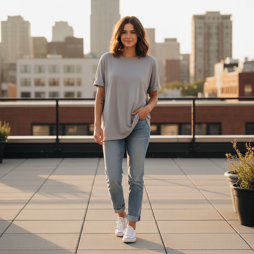 Not every loose T-shirt is a boyfriend tee. What defines this style are a few specific design details that give it a relaxed, borrowed-from-the-closet feel. The fit is slightly oversized, the shape is more boxy than fitted, and the fabric is usually soft and comfortable. These features work together to create a T-shirt that looks casual, effortless, and easy to wear in everyday outfits.