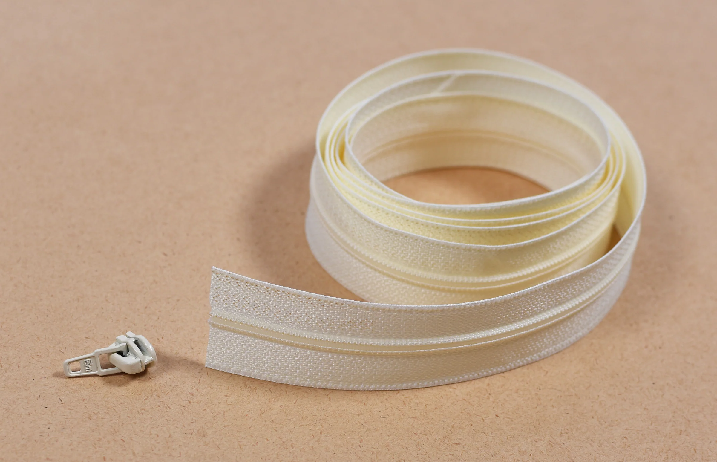 Continuous zippers come on rolls and can be cut to any length. They do not have sliders attached until use, allowing full customization.