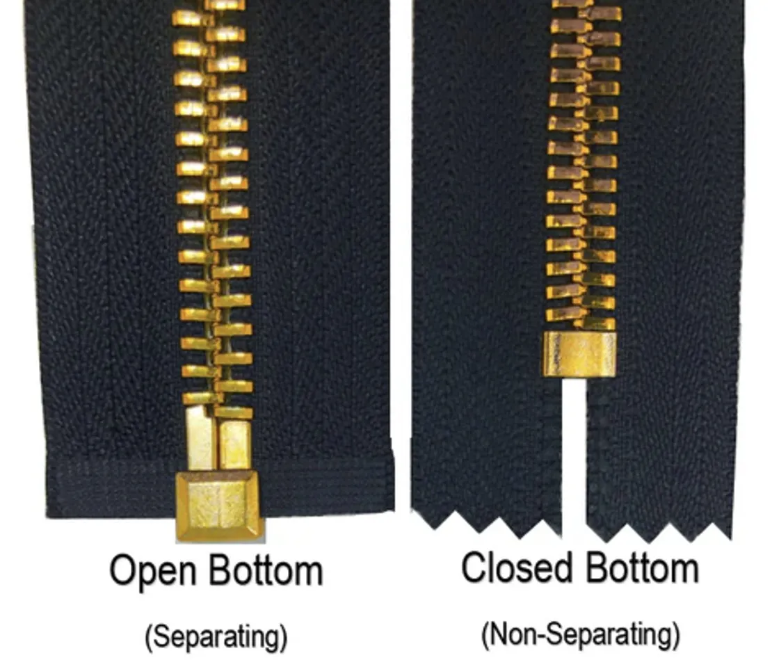 Separating zippers feature a box-and-pin system at the bottom that allows both sides to completely detach. They’re designed for garments that need to open fully.