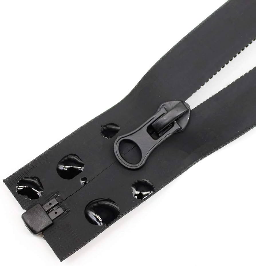 These are coated or laminated with polyurethane (PU) or rubberized materials to prevent water penetration. The zipper teeth are often covered by a protective flap or film.