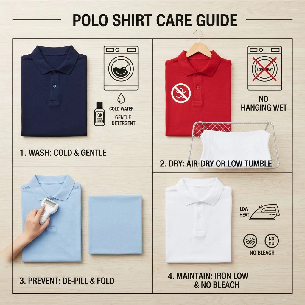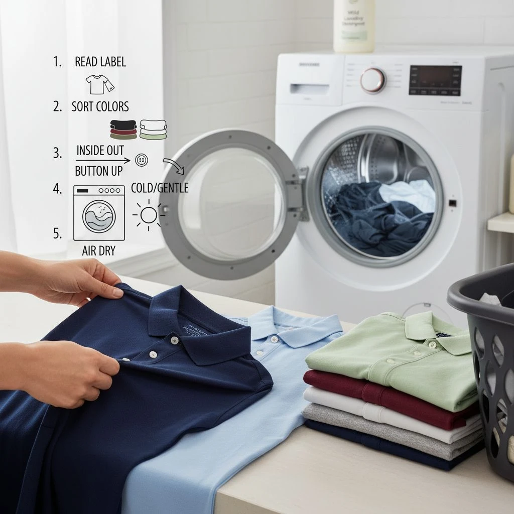 Polo shirts are one of the most practical pieces in any wardrobe. They look neat, feel comfortable, and work well for many situations, from office uniforms and team wear to casual daily outfits. But here’s the catch: polo shirts can lose their shape fast if they are washed and dried the wrong way. Collars curl, colors fade, fabric pills, and logos crack or lift. The good news is that proper care is simple once you know the basics. In this guide, you’ll learn how to wash, dry, iron, store, and treat stains on polo shirts so they stay clean, sharp, and comfortable for a long time.