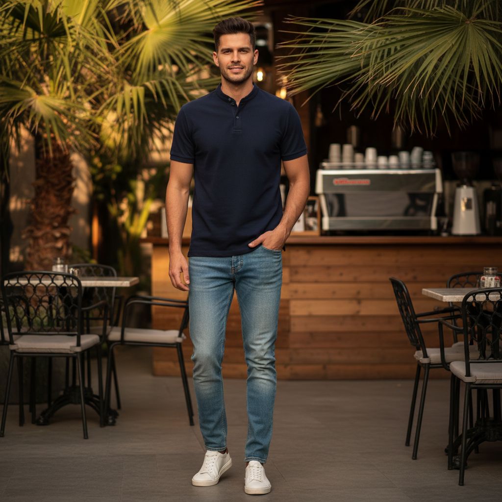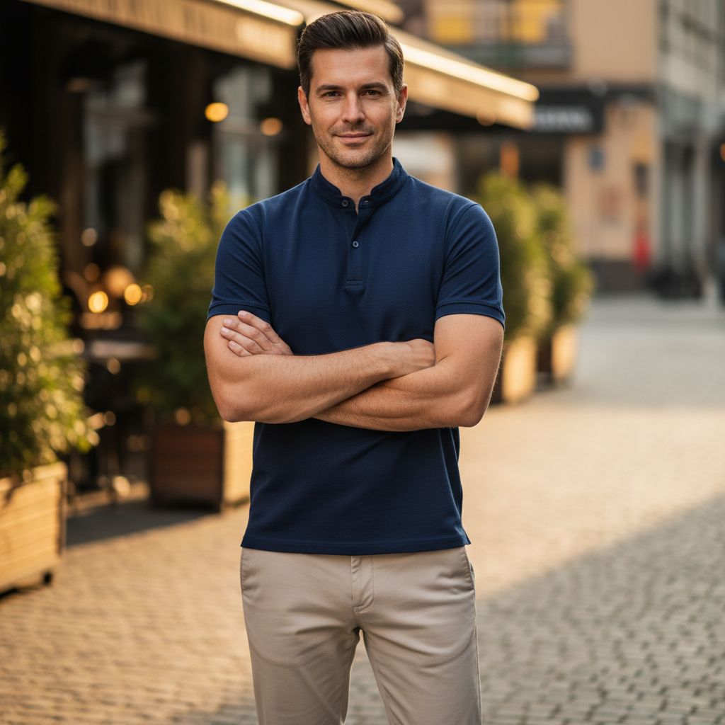 A Mandarin collar polo is a polo shirt that replaces the traditional fold-over collar with a short upright band collar. Instead of laying flat around the neck, the collar stands up slightly and follows the natural shape of the neckline. This style is inspired by the Mandarin collar, which has roots in traditional Asian garments. Over time, modern fashion designers adapted this collar style into contemporary shirts, including polo shirts.