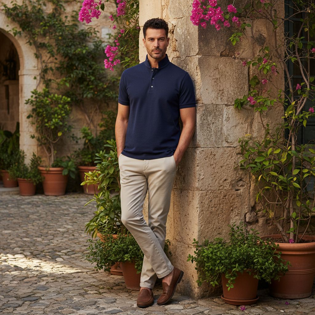 - Stand-Up Collar: The most recognizable feature is the upright band collar. Unlike traditional polo collars that fold down, this collar stands up slightly around the neck. This creates a clean neckline that feels modern and refined.