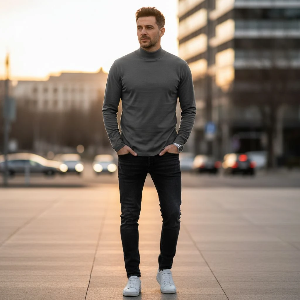 A turtleneck tee gives you the high-neck look of a turtleneck sweater, but in a lighter, T-shirt fabric. It looks clean and minimal, especially in solid colors. It’s great for cooler days when you want warmth without bulk. The only risk is comfort if the neck feels tight, you won’t want to wear it for long. A tee made from lighter fabric than a sweater, but with a high neck.