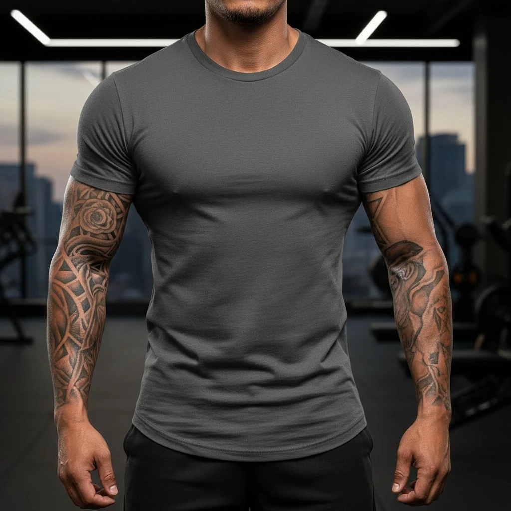Muscle fit tees are cut to emphasize shoulders, chest, and arms. They often have tighter sleeves and a more tapered body, creating a strong, athletic silhouette. This style works best with thicker cotton or a small amount of stretch so it holds shape. The downside is comfort if it feels like it’s squeezing, it will look forced rather than confident. Tight in the chest, shoulders, and arms. Often tapered at the waist.