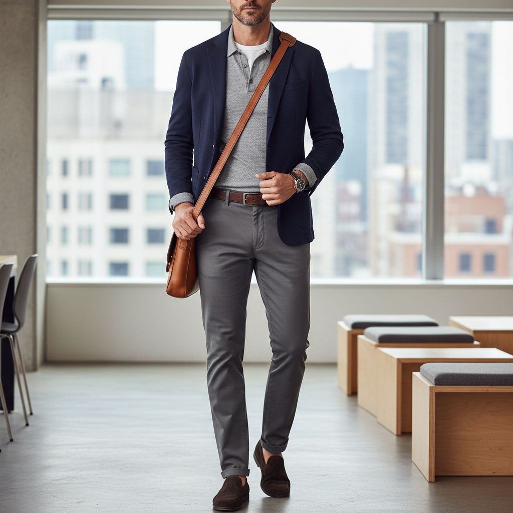 Outfit 1: Classic office look – Navy polo, gray trousers, brown loafers, leather belt. This is clean, timeless, and easy to wear in many offices.