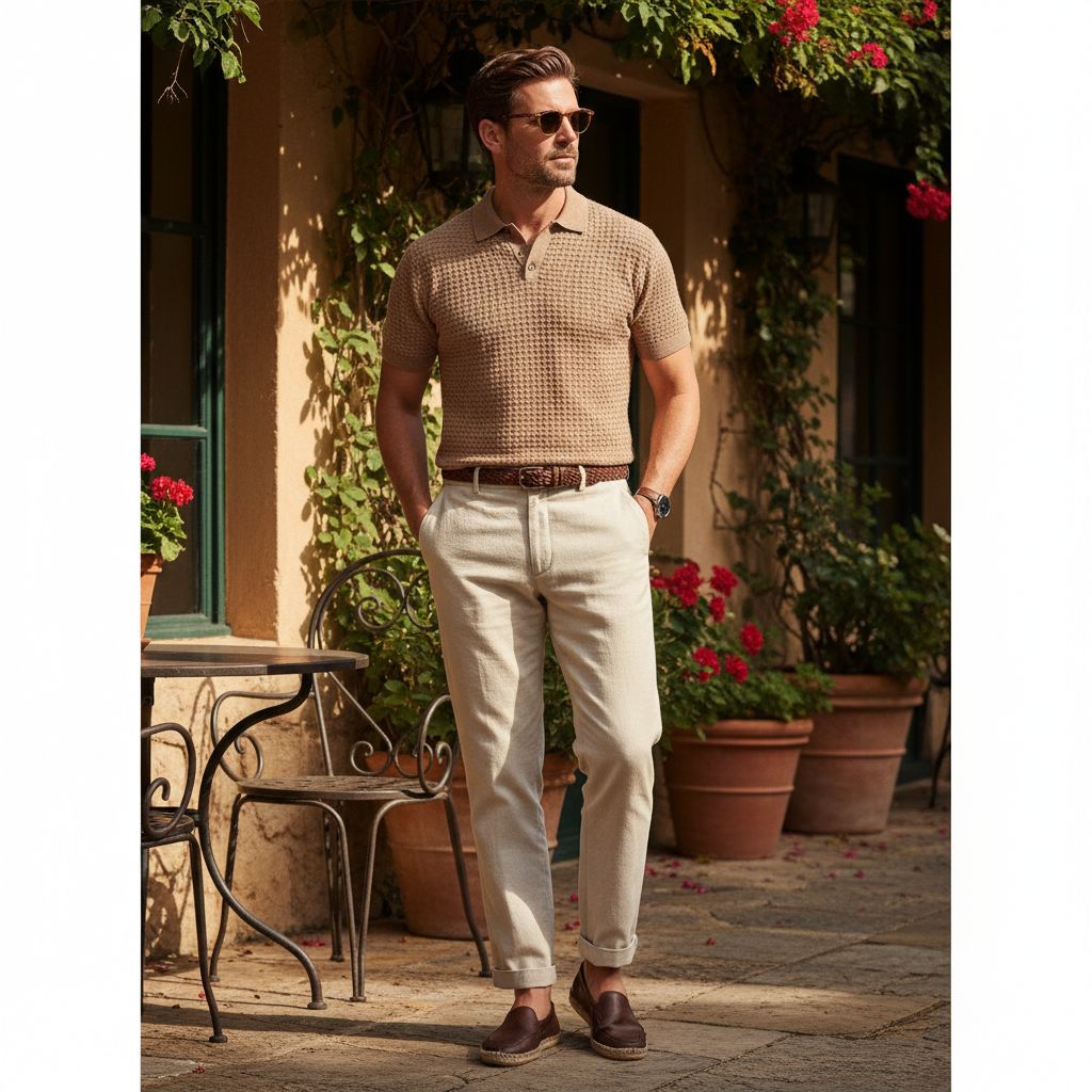 - Light brown polo with cream chinos