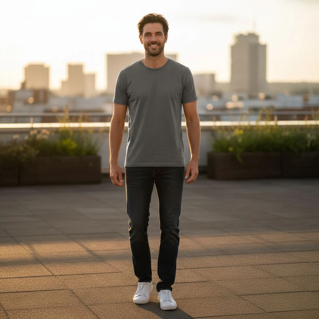 Because it doesn’t cling, it’s more forgiving specially around the midsection. But: forgiving doesn’t mean shapeless. A regular tee can still look sharp if shoulder + sleeve + length are right.