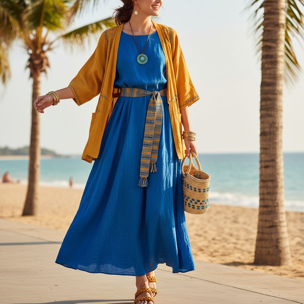 This is a bold and artistic summer pairing. Tibetan blue brings depth and calm, while turmeric adds warmth and energy. Together, they create a look that feels rich, confident, and full of character.