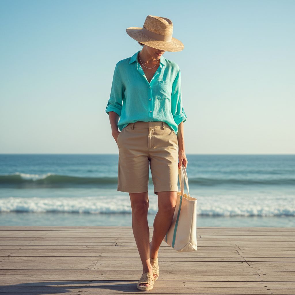 This is one of the most natural and wearable summer color combinations. Turquoise brings freshness, while khaki gives stability and softness. Together, they feel relaxed, earthy, and modern.